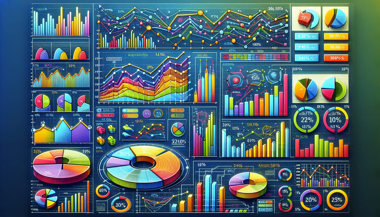 A vibrant and detailed analytics dashboard with colorful charts and graphs